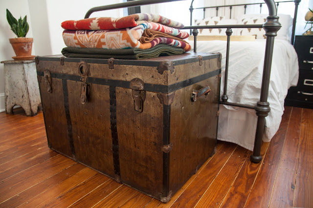 I'd been searching for a trunk to set at the foot of the bed in my guest room and couldn't believe it when I found this brass-plated beauty! After a weekend of sanding and sealing the interior and giving the outside a good oiling, it really shines as a unique storage piece!
