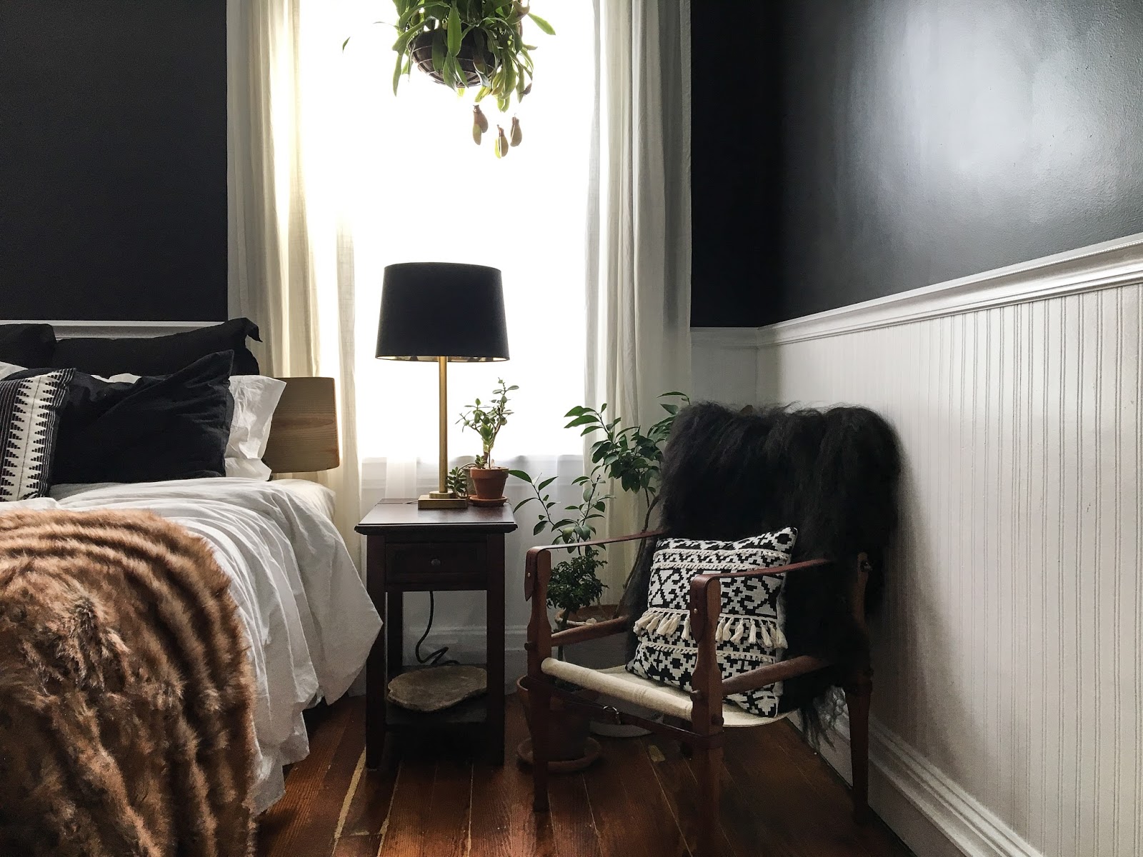 I finally started working on our master bedroom, and couldn't stop obsessing over black paint. In the grand scheme of things, this was my easiest project yet - we replaced the ceiling light, painted the walls, put up curtains, and installed more intricate chair rail molding - relatively small projects compared to the rest of the house. But it's definitely the room that's going to make the biggest before + after impact. Here's a sneak peek at how it's coming along!