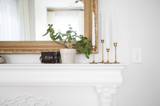 Unfortunately for me, the wood had a lot of flaws - too many to simply stain the wood - so I decided to patch all of the holes and paint the mantel with a fresh coat of paint to match the baseboards and trim.