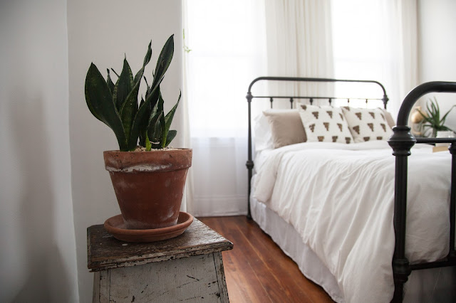 The mantle that I salvaged and restored really inspired me to update the rear bedroom in our house. Until that point, we'd used it as an office that quickly turned into a storage room. Since all of my family lives out of state (and we have plenty of friends in other cities) I thought that turning the rear bedroom into a guest bedroom (with a small desk for me to use when needed) would be the best way to breathe some new life into our old house.