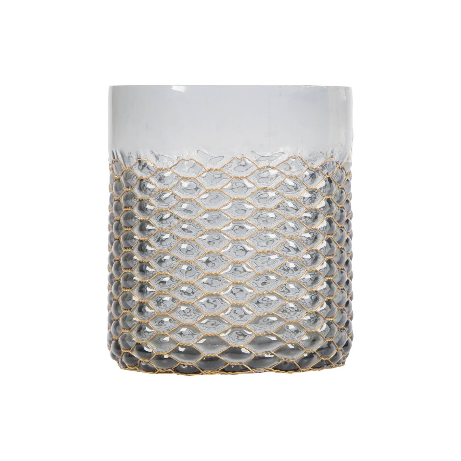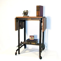 vintage wood typewriter table // glass wire cage vase // icelandic sheepskin